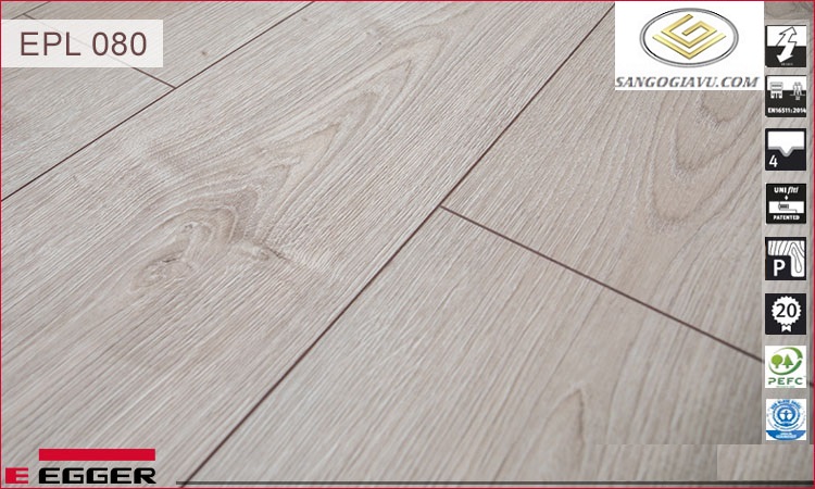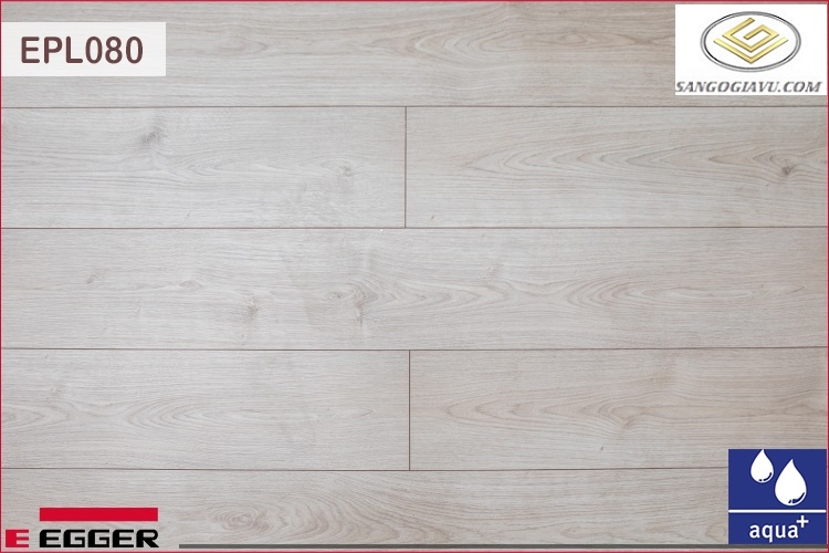 Sàn gỗ Egger Pro Aqua EPL080 là một mẫu nổi trội của sàn gỗ Egger, thuộc phiên bản Egger Pro Aqua+ với đường vân gỗ được thiết kế bắt mắt, chạy dọc theo ván sàn cộng thêm những điểm nhấn ở mắt vân giúp bề mặt sàn trở nên sắc sảo, chân thực. Mẫu EPL080 có tông màu nhạt (vàng pha chút nâu nhẹ), điều đó giúp sàn có thể vừa phối với đồ nội thất mang màu tối (đen nhám, xám khói), cũng có thể phối với đồ màng màu sáng như xanh da trời.