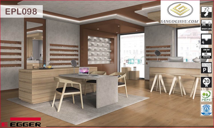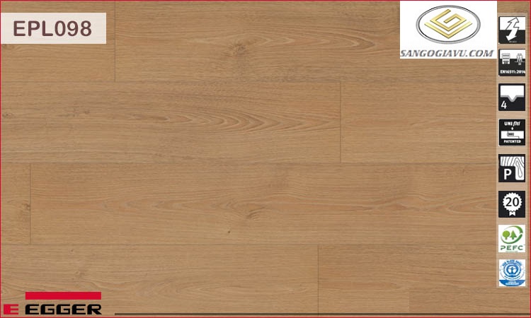 Điểm đặc biệt của EPL098 chính là công nghệ của nó: Một mặt hàng siêu chịu nước có thể ngâm từ 5 – 7 ngày mà không hè cong vênh hay phồng rộp, bề mặt AC4 với khả năng chống mài mòn – trơn tượt – trầy xước giúp sàn gỗ luôn mới.